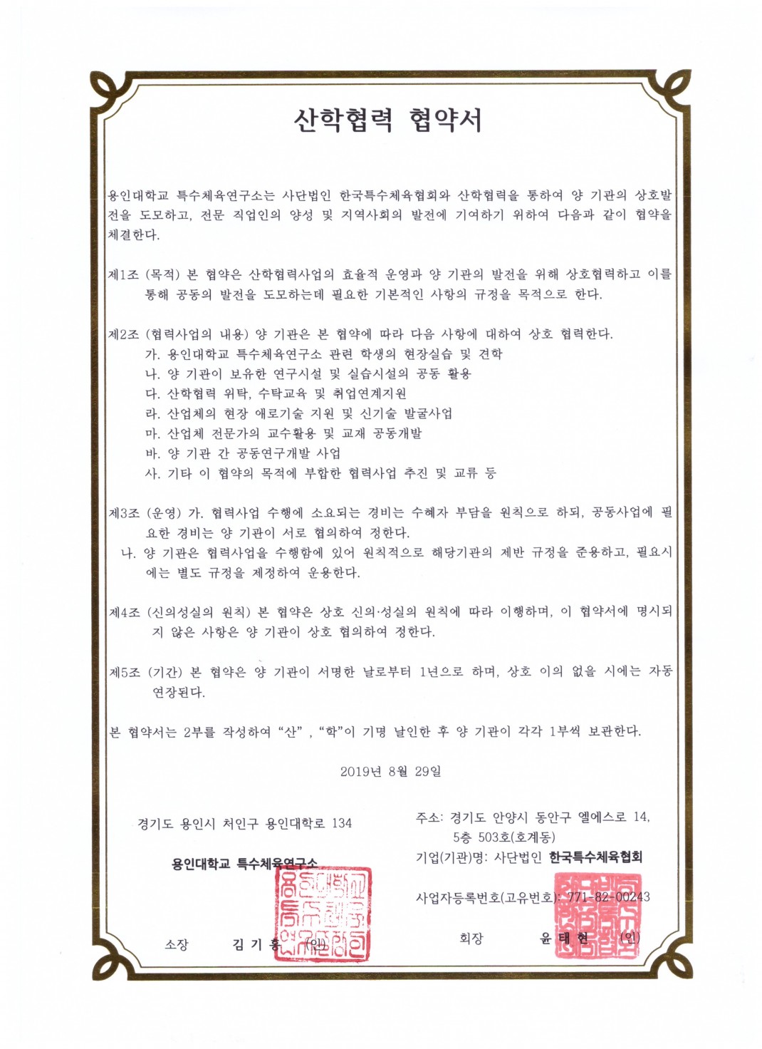 용인대학교 특수체육연구소 MOU 체결 페이지 정보 작성자 관리자 댓글 0건 조회 1,302회 작성일 19-09-06 13:02 본문 한국특수체육협회와 용인대학교 특수체육연구소가 특수체육전문지도자 양성을 위해 MOU를 체결 하였습니다. 목록 이전글2019년 하반기 한국특수체육협회 매거진 창간호 발행 19.09.30 다음글2019 한국특수체육협회 홍모물 발행 19.07.11 댓글목록 댓글목록 등록된 댓글이 없습니다.